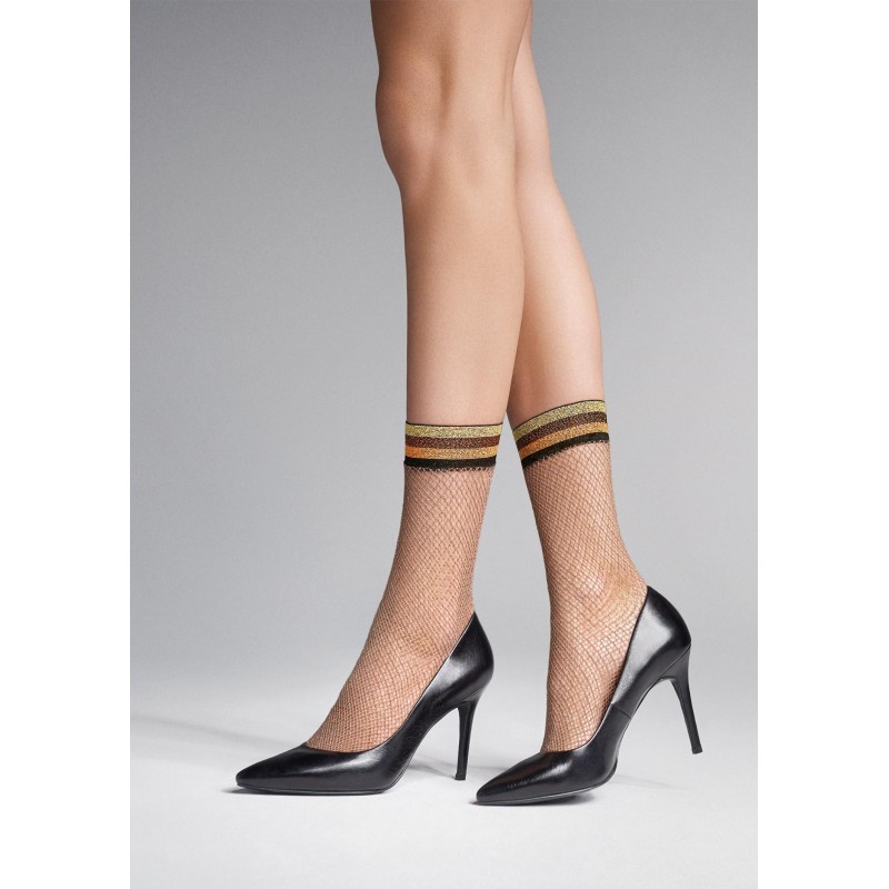 Smulkaus tinklelio kojinaitės su liurekso siūlu. Užbaigtos 4 cm dekoratyvine elastine juostele.